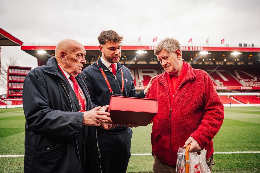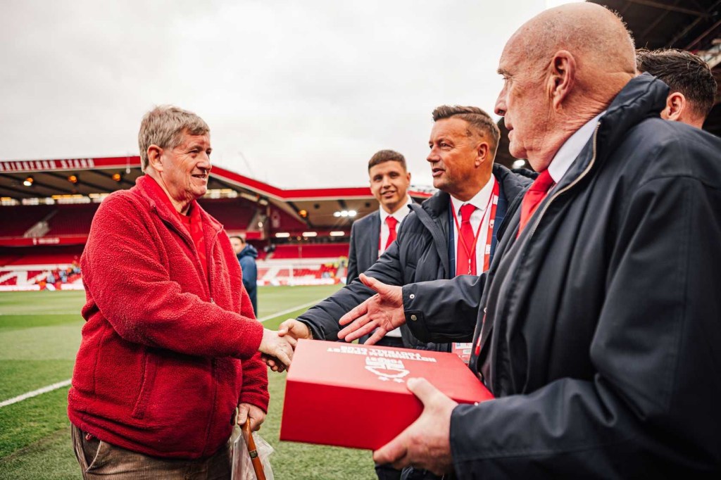 Miracle man John O’Hare was joined by Nigel Jemson, Paul Anderson and Julian Bennett to present Steve with a signed home shirt by the side of the pitch ahead of Forest’s 1-0 victory over Ipswich.
